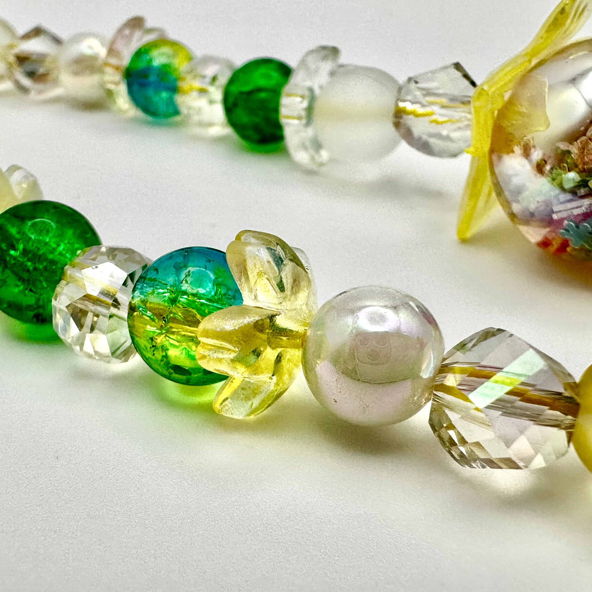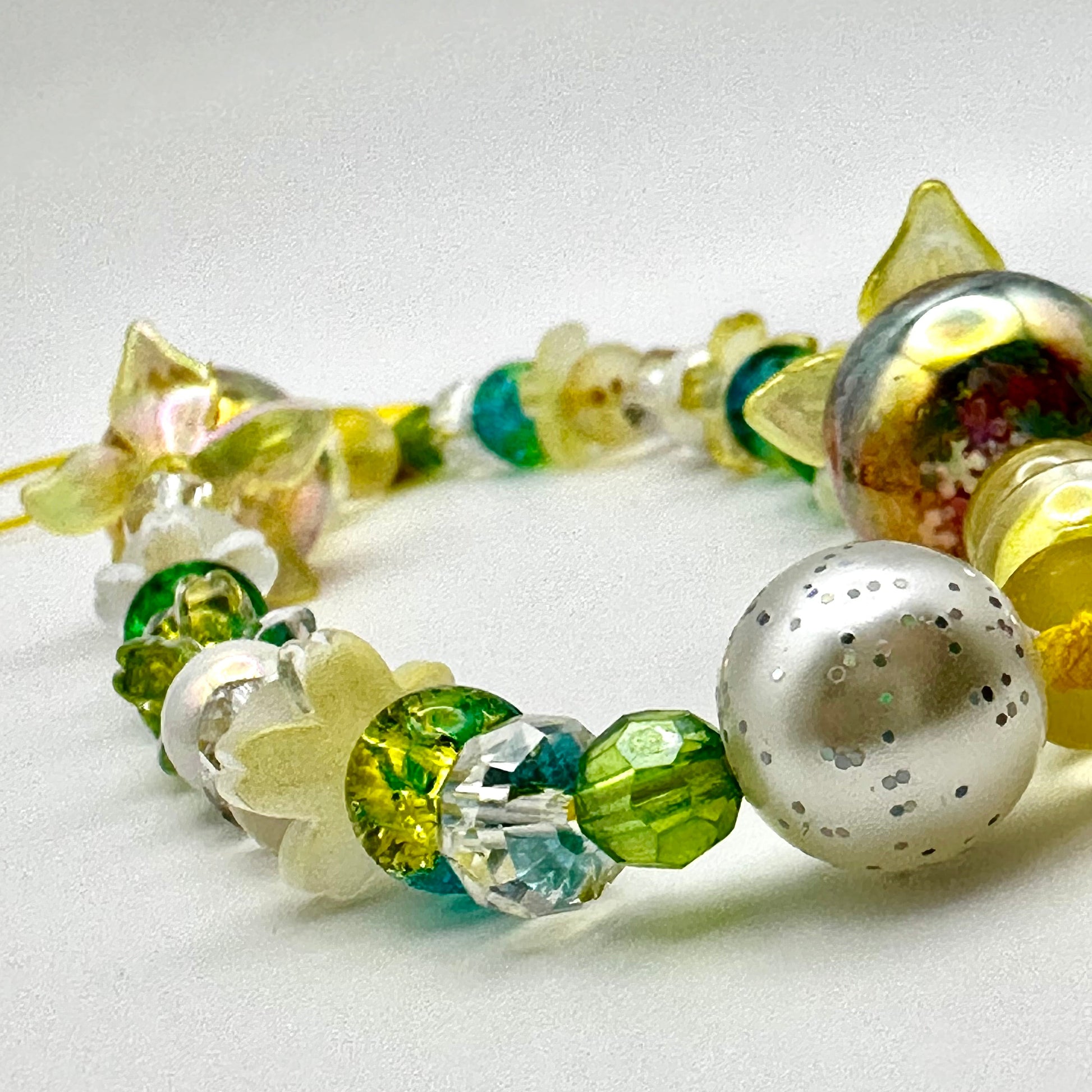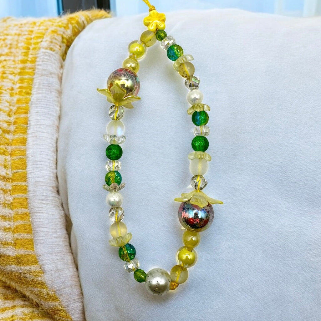 Bring a touch of nature’s charm to your accessories with this handcrafted beaded phone charm. Featuring a vibrant mix of yellow, green, and earthy-toned beads, it radiates freshness and energy. The design includes shimmering glass beads, playful cracked textures, and a standout globe bead with swirling colors, adding depth and uniqueness to the piece. Finished with delicate flower-shaped beads, this charm is both whimsical and elegant.