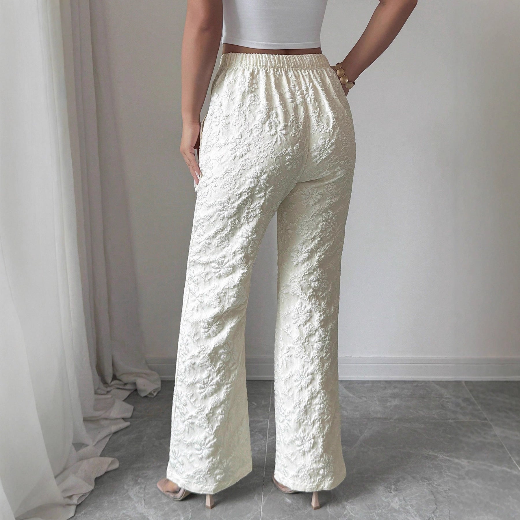 Pair these pants with a fitted white or pastel top and nude heels for a chic monochrome look. Add a woven handbag or gold jewelry to highlight the beautiful jacquard texture.
