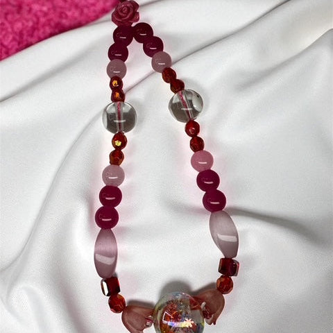 Elevate your accessory game with this elegant handmade phone charm, crafted in rich shades of red and pink. Featuring a vibrant mix of deep ruby beads, frosted rose-toned beads, and faceted crystal accents, it strikes the perfect balance of bold and feminine. Two clear glass beads add a modern touch, while the charm is beautifully finished with a large globe bead filled with colorful floral details and delicate flower accents for a whimsical flourish.