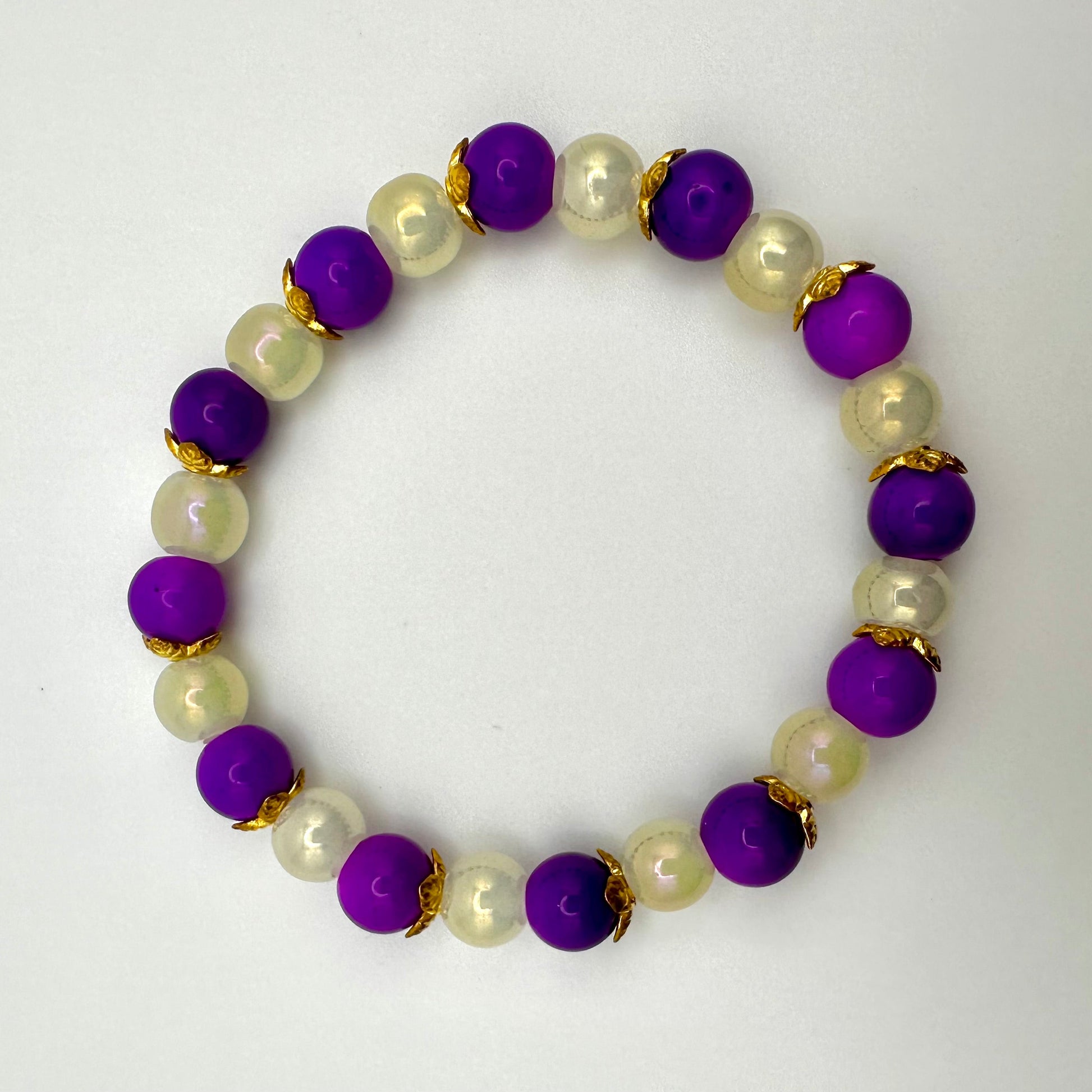 Make a bold yet refined statement with this handcrafted bracelet, featuring a striking mix of deep purple and milky white beads accented by gold spacers. The vibrant contrast of colors paired with shimmering gold details gives this bracelet a regal and timeless appeal.